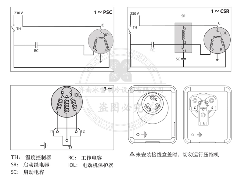內(nèi)部過載保護(hù)器保護(hù)壓縮機(jī)免遭過載電流和超額溫度。請(qǐng)遵循當(dāng)?shù)赜嘘P(guān)電源線保護(hù)的規(guī)定。壓縮機(jī)必須接地。